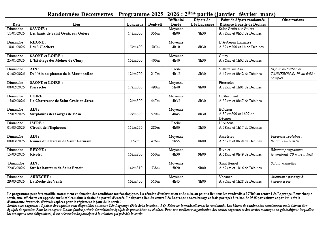 PROGRAMMES DES RANDONNEES